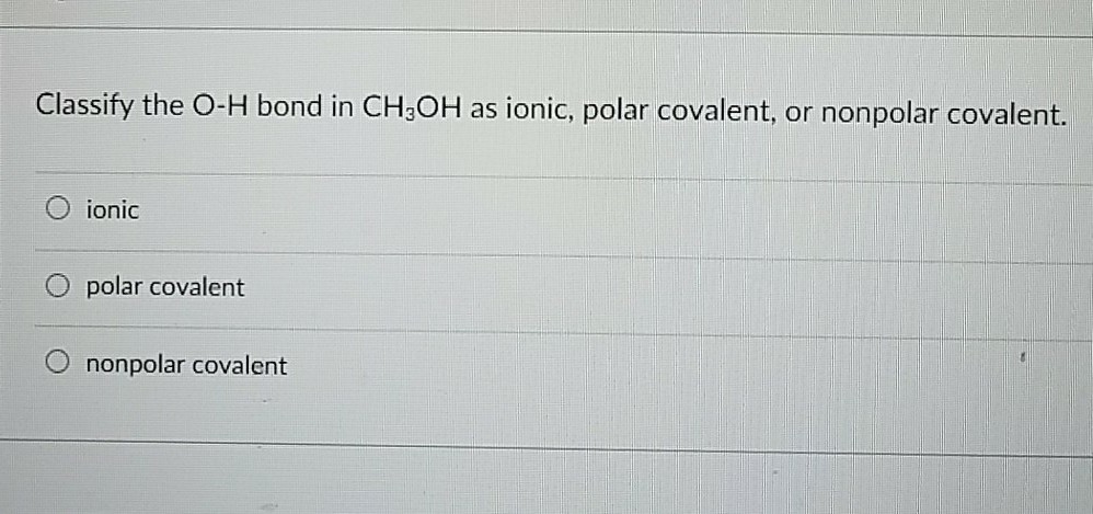 Solved Classify The O H Bond In Ch3oh As Ionic Polar Cov Chegg Com